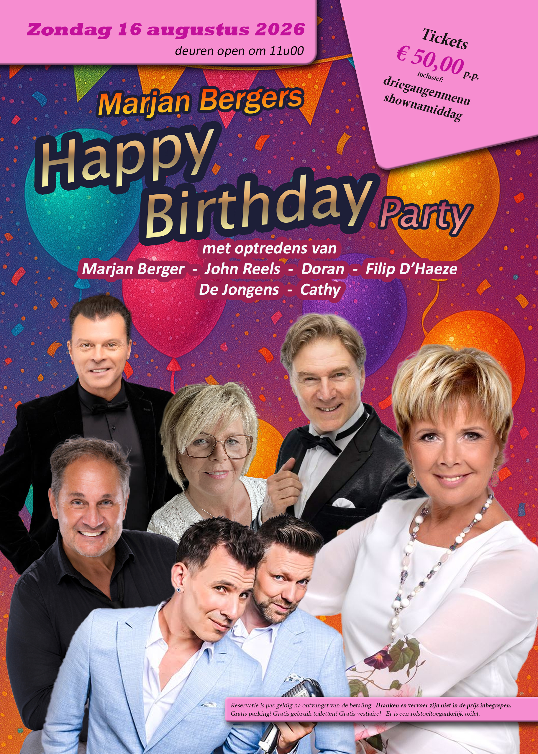 Marjan Bergers Happy Birthday Party Zondag 16 augustus 2026 – deuren open om 11u00 De Kaasboerin, Mol-Postel Programma: * Driegangenmenu * Shownamiddag met Marjan Berger, John Reels, Doran, Filip D’Haeze, De Jongens en Cathy. Tickets: € 50,00 p.p. Fan van onze showformules? Bekijk dan zeker onze reeks aan prachtige shownamiddagen 2026. Inschrijven Marjan Bergers Happy Birthday Party - Ticket € 50,00 p.p. Beschikbaar Tickets: 178 inclusief driegangenmenu, shownamiddag en avondlunch Het "Marjan Bergers Happy Birthday Party - Ticket" ticket is uitverkocht. Je kunt een ander ticket of een andere datum proberen. Volgende Datum aug 16 2026 Tijd 11:00 am - 6:30 pm Categorie Themashows Boek nu